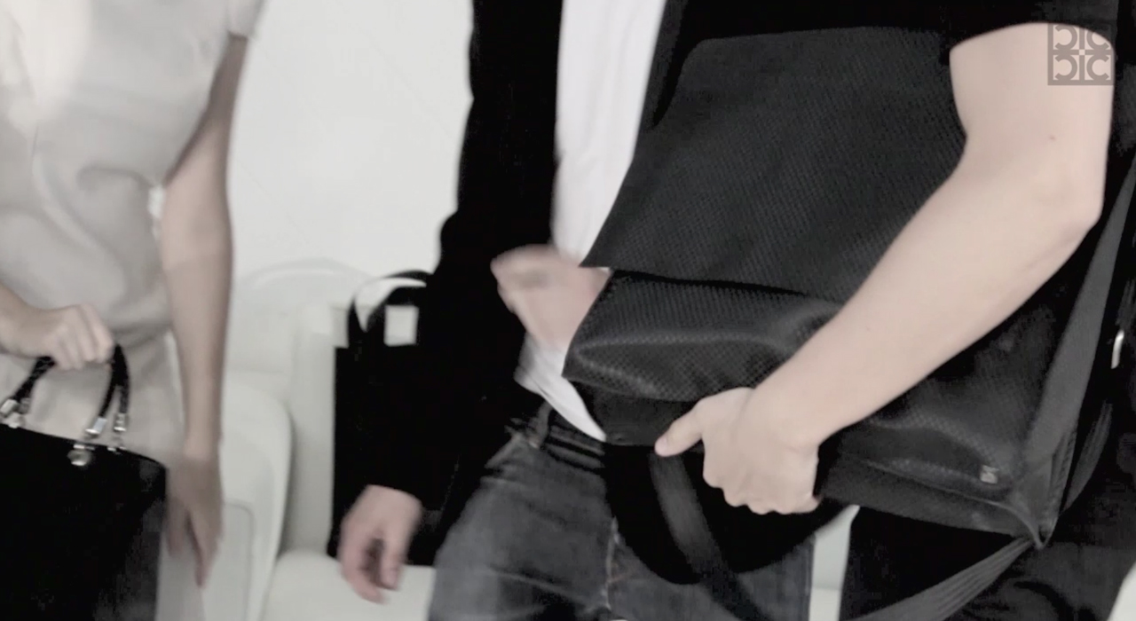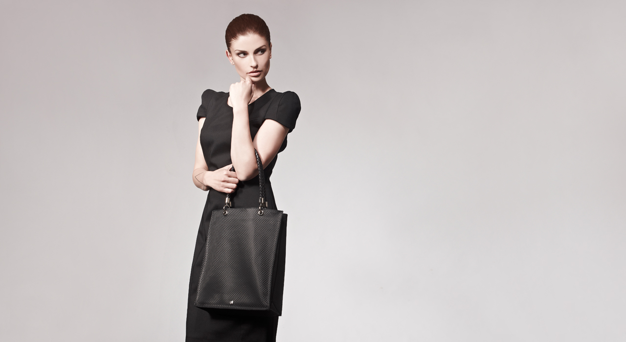 Subtle woven straps for men; lustrous metal trims with plaited black leather handles for women.